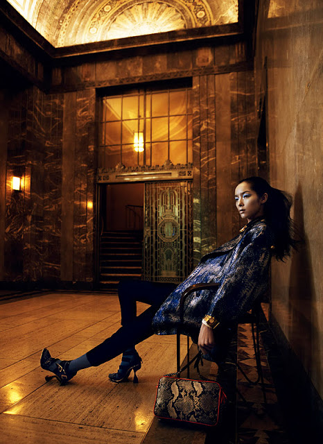 Art Deco Cinema – Lachlan Bailey captures the art deco trend from the spring collections for the January edition of Vogue China. Outfitted by Alastair McKimm, model Fei Fei Sun gets swathed in colorful ensembles featuring the designs of Yves Saint Laurent, Stella McCartney, Balenciaga and Reed Krakoff amongst others. Shimmering makeup by Yadim and pulled-back hair by Rudi Lewis complete the vision of nighttime glamour.