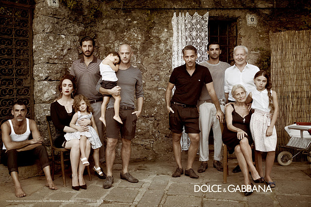 Dolce & Gabbana explain, "The photos shot by Mariano Vivanco are intentionally candid and reminiscent of scenes from an Italian-style comedy, where actors portray life in a Southern Italian village: a baptism, Sunday with the family, a portrait with mother, at the bar with friends, afternoons at the beach, courting the village beauty, guy talk, a stolen kiss on the docks and a birthday party with relatives. The spontaneous images portray fragments of real life and highlight the values of Dolce&Gabbana: Italian spirit, tradition, family, love, passion, joie de vivre and the ability to capture the modernity of the past and to render it contemporary