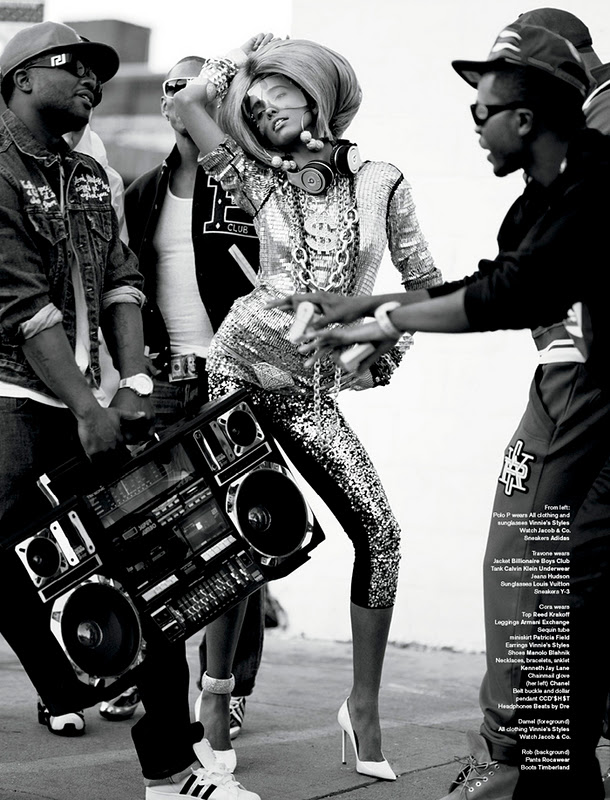 Fashion has always followed its own beat and V Magazine first ever Music issue (on stands January 12th) pays tribute to the dynamic influence of trend setting performers through the ages. Inside V75 Sebastian Faena and Carlyne Cerf De Dudzeele explore the relationship between hip hop & high fashion in an outlandish editorial. Credited as the very first editor to embrace urban culture (Carlyne brought the look to the pages of Vogue Italia way back in 1990) Carlyne has a long history of taking looks off the street and translating them for the editorial pages. Cerf De Dudzeele tells V “I love girls that men want to follow in the street—glamorous, sexy, powerful. You’re born with it, it’s not something you learn. I have always been obsessed by hip-hop. L’attitude is always right.”